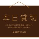 本日貸切営業! 2023年2月18日 カテゴリー: お知らせ 店主のくるぽんです。2月18日の土曜日です。 誠に勝手ながら本日は、12時より貸切営業とさせて頂きます。17時からの通常営業はお休みとなりますのでご了承くださいませ。またのご予約・ご来店をお待ちしております。 旬采割烹く […]