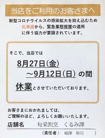 店主のくるぽんです。8月31日の火曜日です。 8月も最終日。早いもので明日から9月です。もうすぐ食欲の秋と言うくらい食材豊富な時期になるのに。松茸の土瓶蒸しとか・・・。 9月2日(木)ご注文分よりテイクアウトのメニューが […]