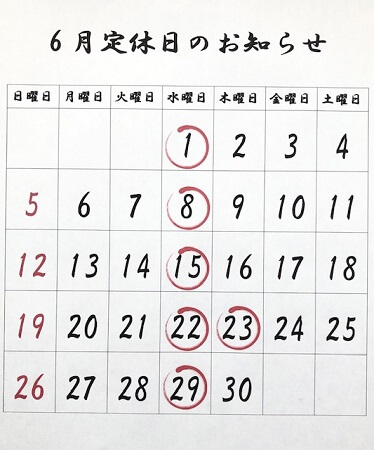 6月定休日のお知らせ!