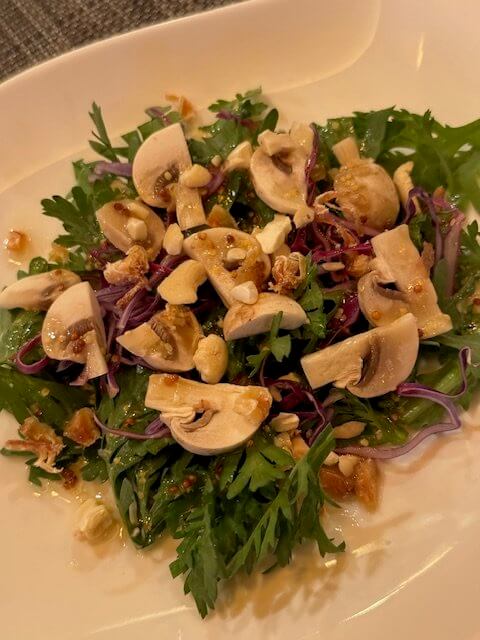 【ナッツ入り菊菜とマッシュルームのサラダ】