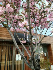 店先の八重桜が満開です。